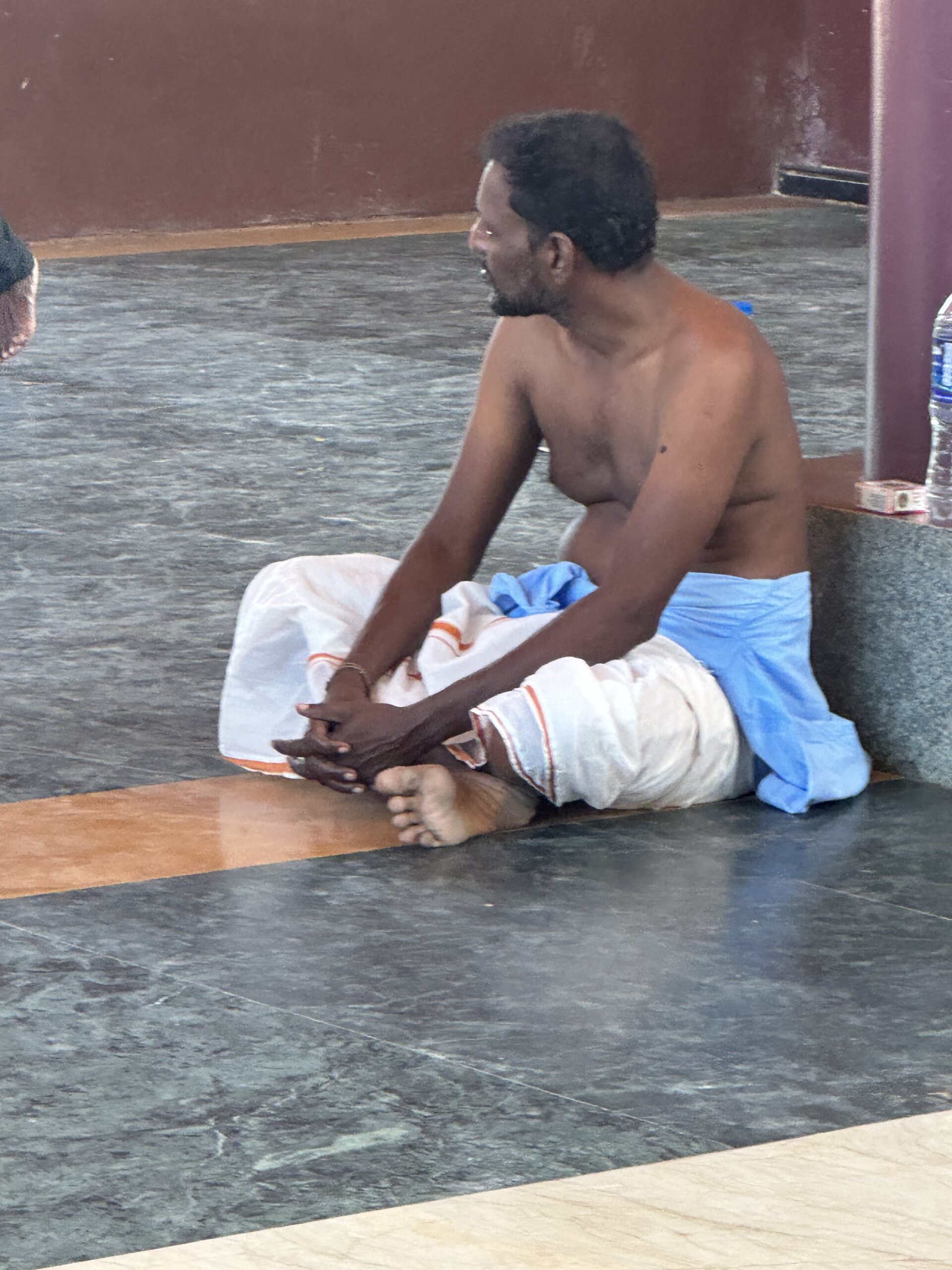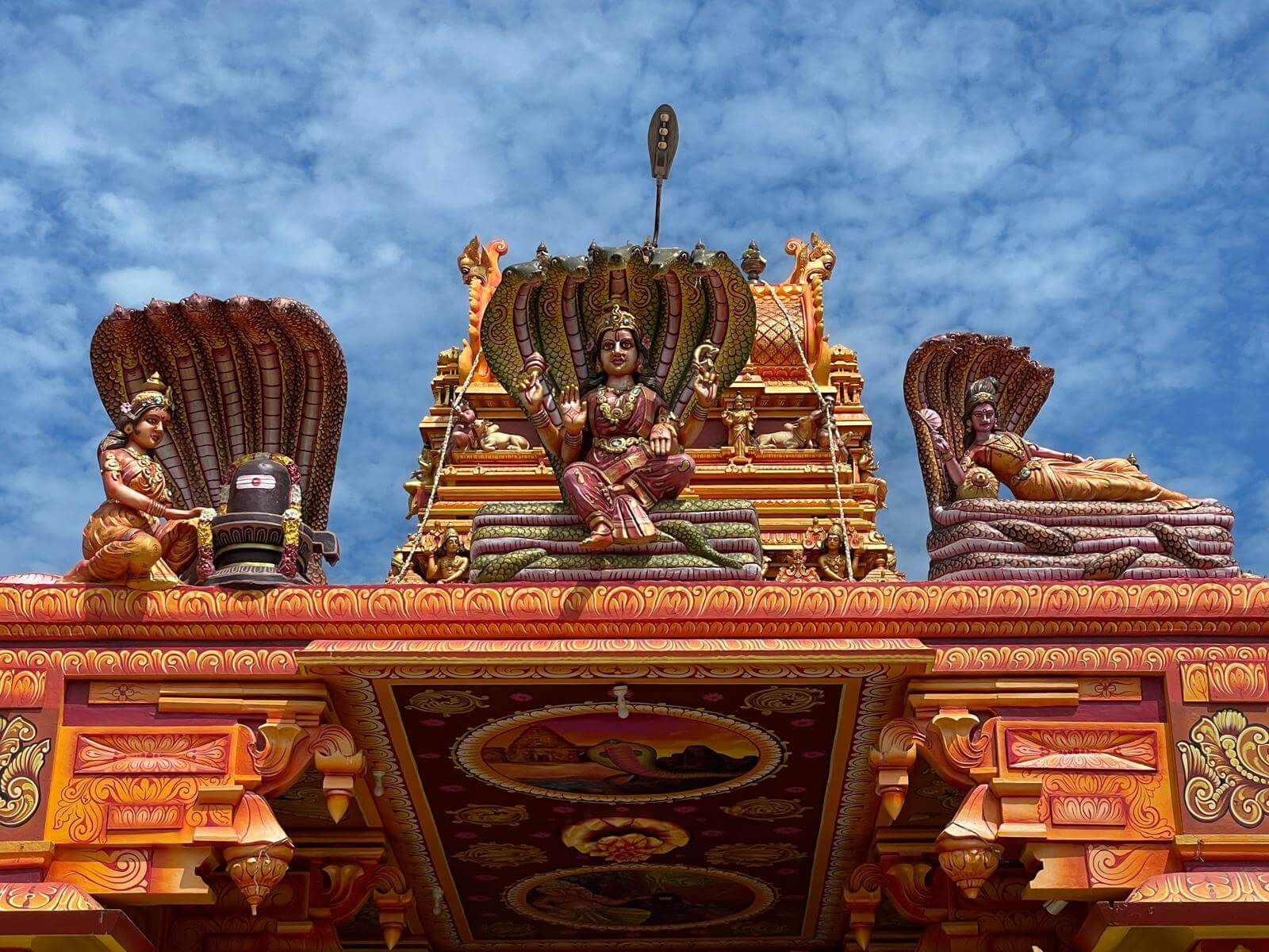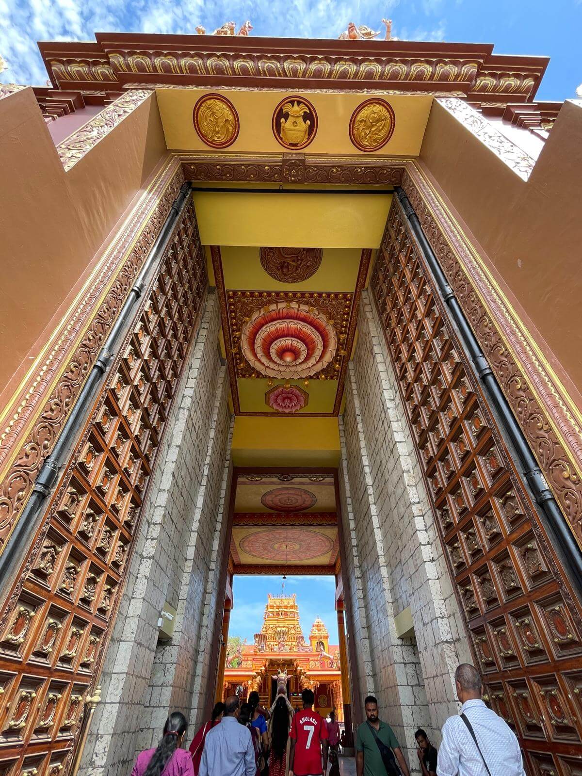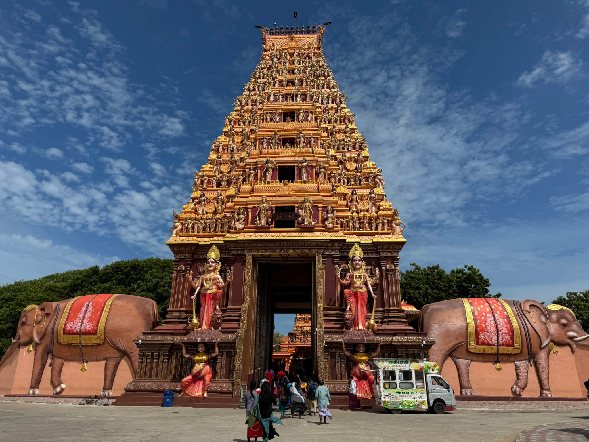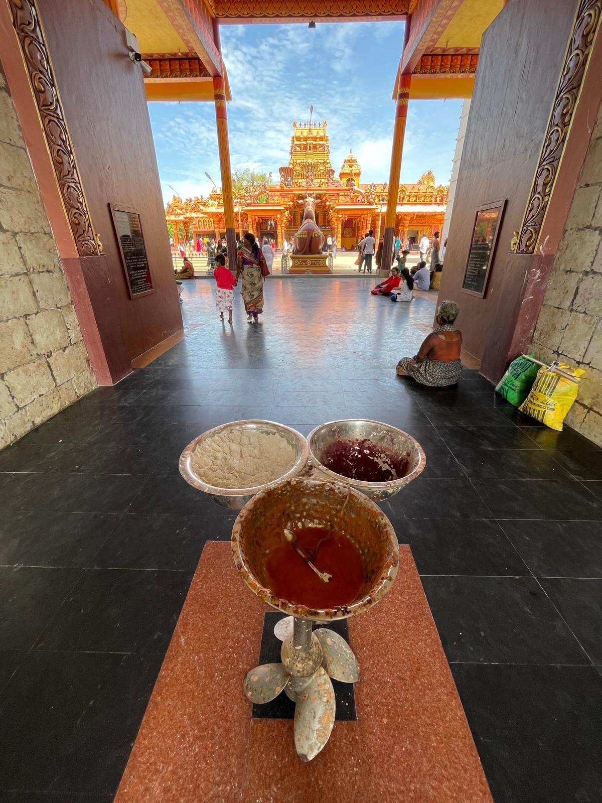 Hindu temples are often brightly coloured but some are painted all gold. You can only photograph them from outside The Nallur Kandaswamy Kovil temple is a historical building. During the year they have colourfully processions and celebrations. They were just praying while we are here but you can get a blessing if you wish