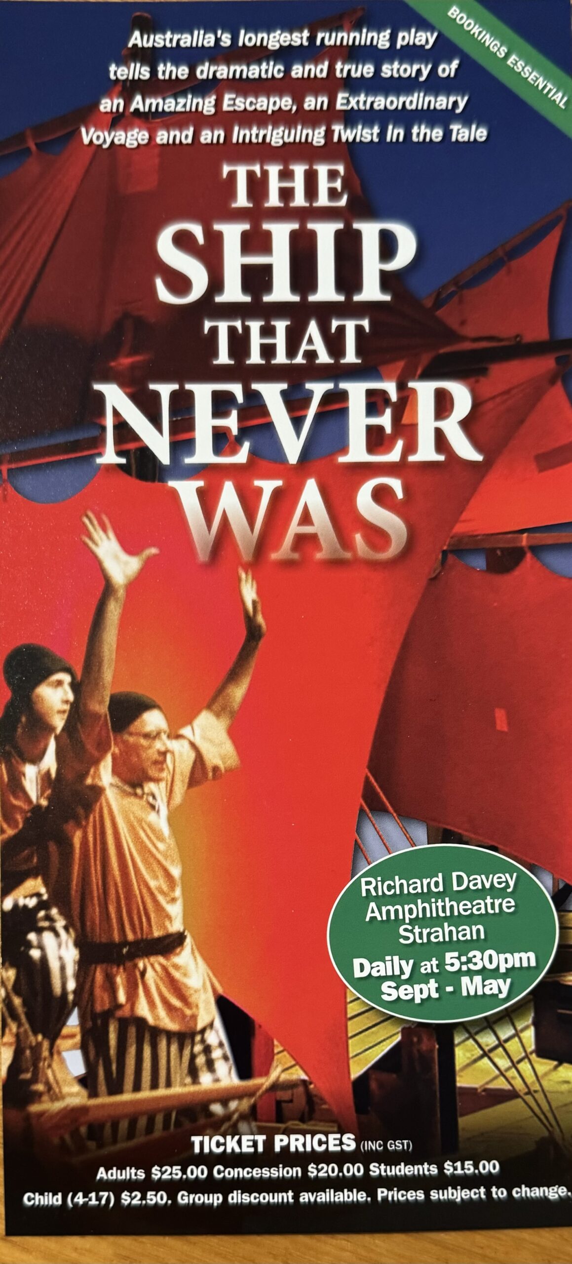 Now you would think this was a win ,win situation for government and convicts. Government is selling the boats and convicts are not causing problems. No way…..the Government decided convicts should be punished and wanted them moved to Port Arthur. One group of 10 took an unfinished boat, made it sea worthy and escaped. A year later , 4 were recaptured in Chile and brought back to be tried……..”The ship that never was”…..we went to the play but more later.